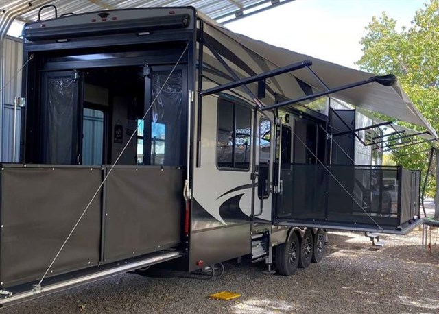 This unit has been such a nice unit for us, and we have enjoyed it very much (the few times we have used it), but we are just looking to down-size. It has always been covered when not being used. Comes fully equipped with 3 - 100 Watt Solar Panels and Inverter. Features a 13' Garage, 3 Roof-Mount AC's, fold down side patio, and full rail enclosure for rear ramp patio. The trailer is with us in New Mexico, but we have connection in Utah and Wyoming, and are open to meeting halfway or delivering. Financing is available! More information and pictures are available upon request. Feel free to contact by phone the number below.