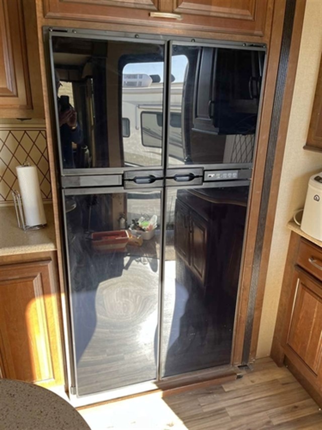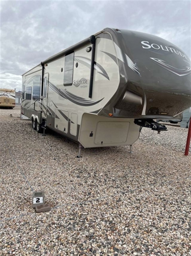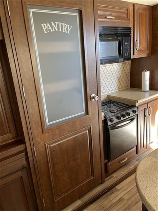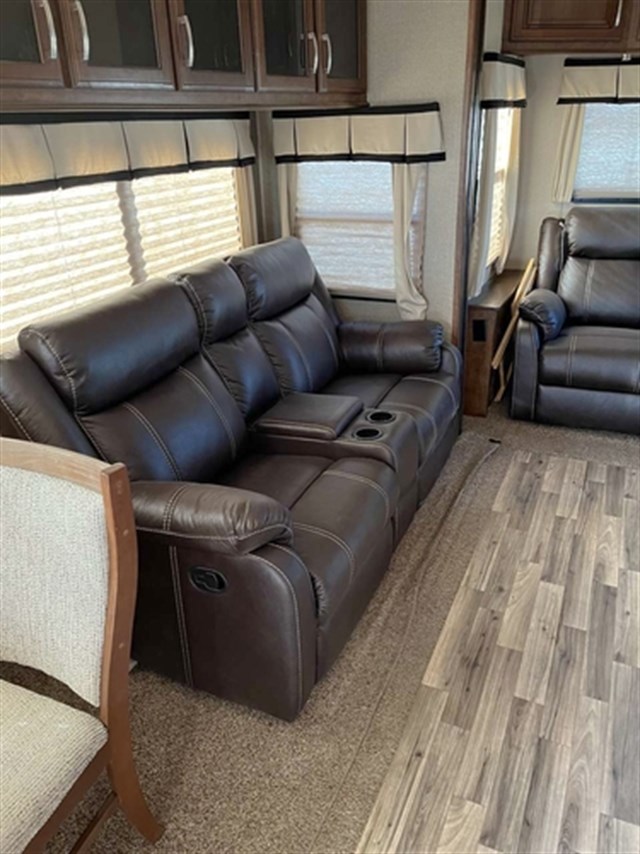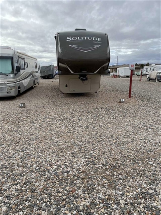 A very spacious 2015 Solitude Grand Design 36.9 ft. 5th wheel. Tons of living space with a new sofa and love seat that each have two recliners that face the television and electric firplace. The fireplace provides ambiance as well as heat. Large pantry with stationary shelves as well as pull out shelves. Lots of storage area in the entertainment center and above the sofa and love seat. The sink is in the center island which allows for easy prep work and good use of counter space. The refridgerator/freezer has lots of space for your needs. The kitchen table is new but the chairs (which all have storage under the seats) are the originals and in good condition.