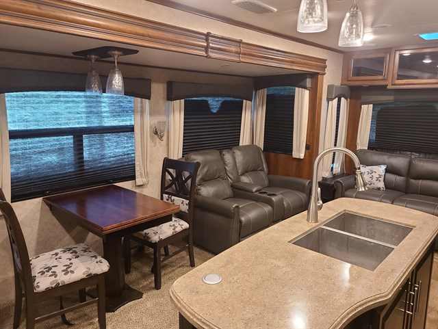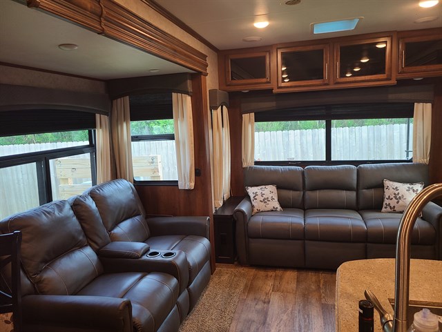If you only like to travel in luxury, take a step inside this Eagle travel trailer to find what you have been looking for. Model 330RSTS offers the owner a master bedroom with plenty of storage and a closet prepped for a washer/dryer. The dual slide outs in the main living and kitchen area provide enough room to walk around the much desired kitchen island to get to the walk-in pantry, or near the LED fireplace to relax on the tri-fold sofa. You will even enjoy the recliners and a free-standing dinette for more seating.