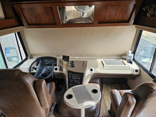 Onan generator, Ford engine, Ford chassis, tilt steering, cruise control, power patio awning, pass-thru storage, pass-thru storage with side swing doors, black tank rinsing system, exterior shower, exterior entertainment, booth converts to sleeper, night shades, 3 burner range with oven, glass shower door, power cab over bunk, king bed, 2 TVs and much more!