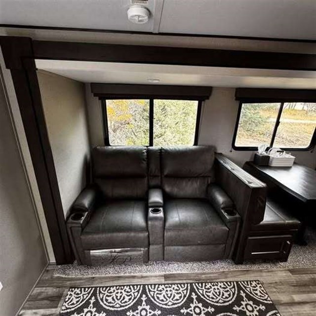 This spacious, dual-entry travel trailer offers unforgettable camping with a private bunkhouse (four bunks, storage, half bath) and a comfortable main living area with theater seating and a 32" TV. 1 Ample storage, a full indoor kitchen, and an outdoor kitchen with a two-burner cooktop and refrigerator provide all the comforts of home. Built for durability with Quadseal insulation and a heated underbelly, it also features an easy setup with a power tongue jack and an all-in-one utility center.