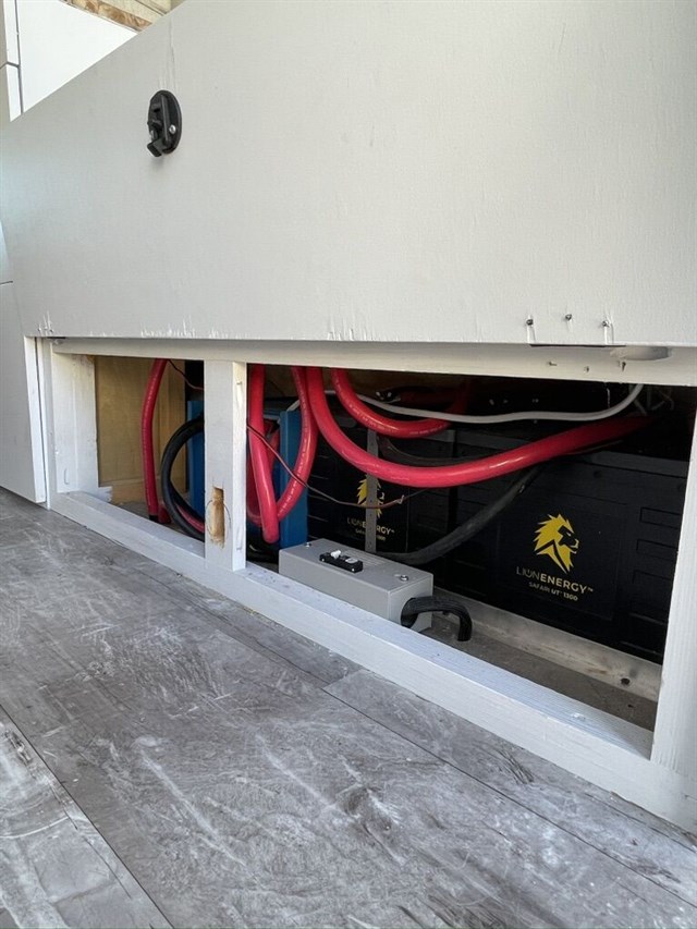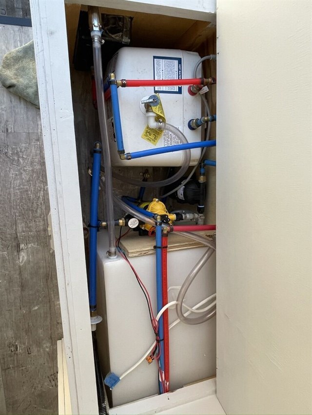 28 gallon gray water tank with electric ball valve for easy dump.\