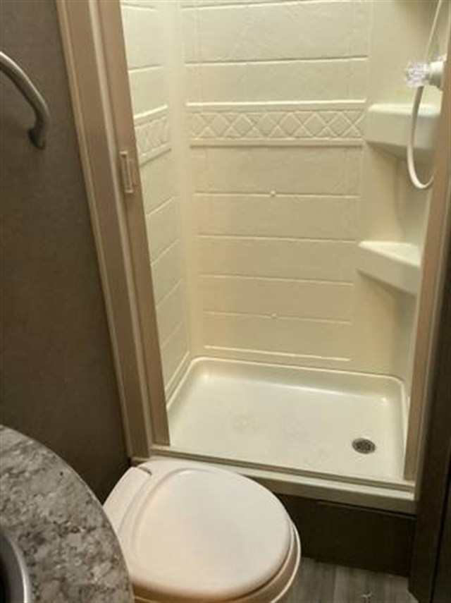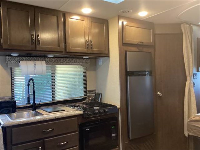 The kitchen includes a good-sized refrigerator/freezer, double kitchen sink, stove, and convection microwave oven. The refrigerator can run on electric or LP power for flexibility while driving.