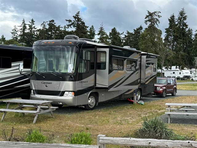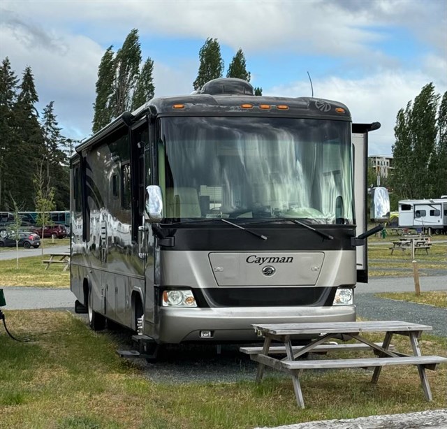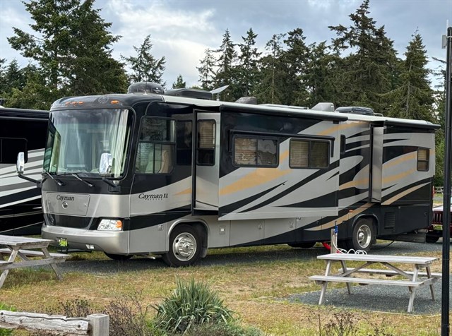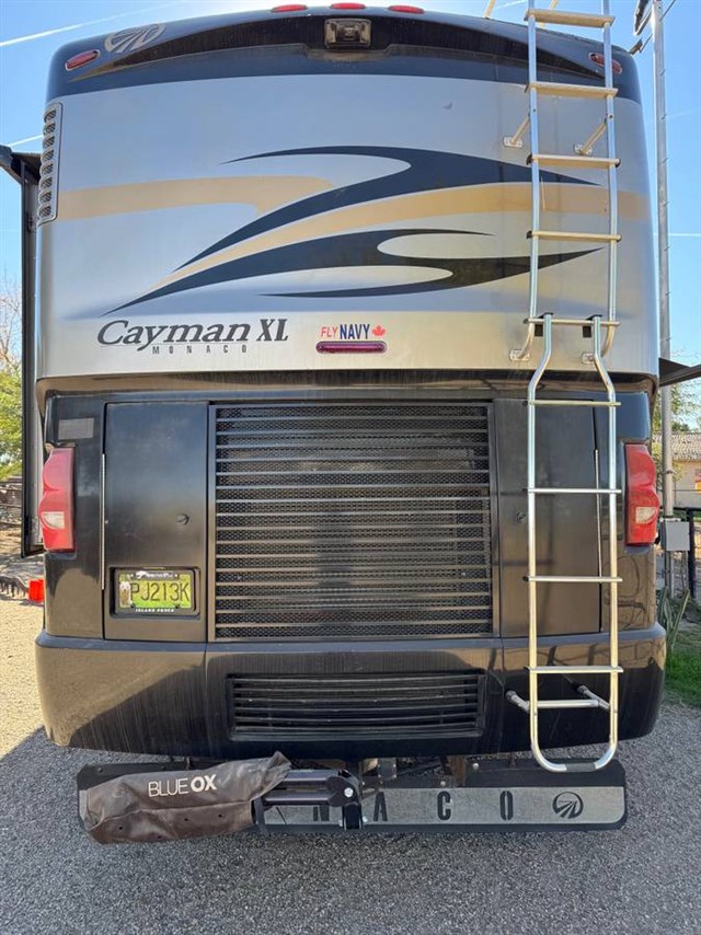 This 2008 Monaco Cayman XL is a robust Class A diesel pusher RV, approximately 38 feet long, built on a Roadmaster chasis featuring a 340 HPCummins ISB engine and a Allison automatic 6-speed transmission with hydraulic leveling, dual A/Cs, 2 slides, and amenities like solid surface counters, an inverter, and ample storage, designed for comfortable, long-term travel with features like full air brakes and a 3-camera system and much more!