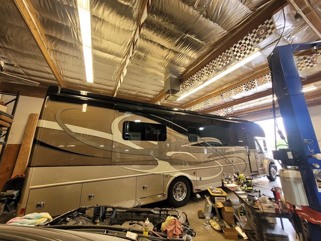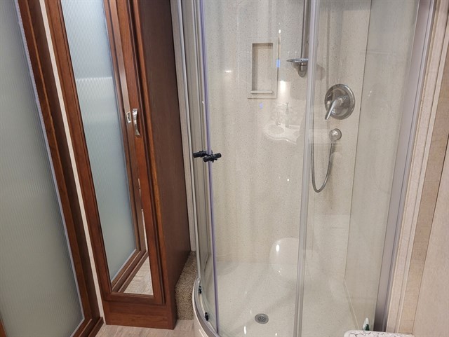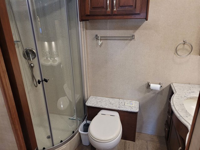 It offers significant storage and residential features, allowing for self-sufficient, long-term RVing.