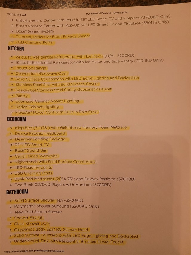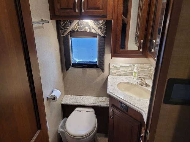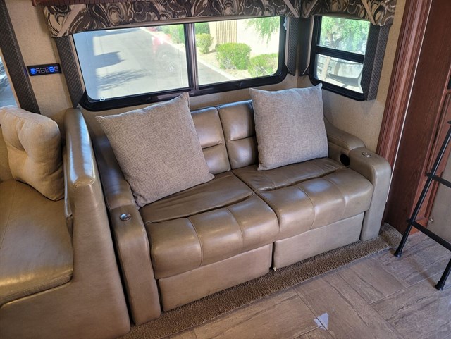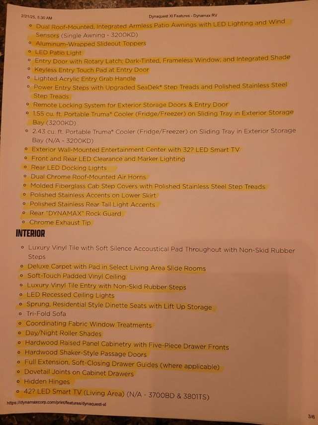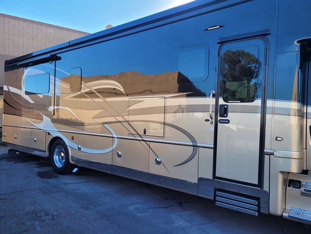 Exterior: Full body paint, LED lighting, power patio awning, aluminum-wrapped toppers, keyless entry, and a 3-camera monitoring system.