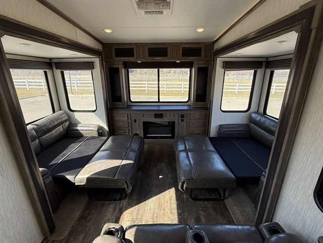 This unit is in beautiful condition, meticulously kept, and fully road-ready. Equipped with 14-ply heavy-duty tires, it’s prepared for long-distance travel or full-time living. The large 20 ft power awning provides expansive outdoor shade, while the 2nd A/C ensures cool, comfortable temperatures throughout.