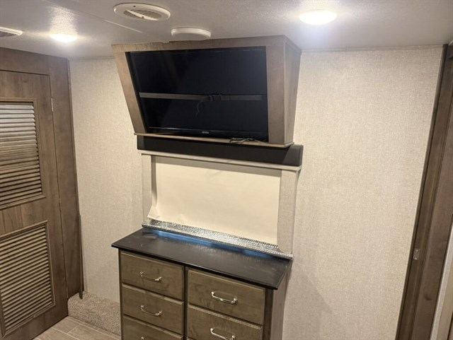 With this Montana fifth wheel, you can have adventures any time! The private bedroom has a barn door that closes it off from the rest of the unit, and the bedroom is fully equipped for comfort with a queen bed slide, a dresser with 32" LED HDTV, a clothing hamper, a huge closet, and an area prepped for the optional washer/dryer. The main living area is also going to feel exceptionally comfortable with its hide-a-bed sofa, power theater seating, fireplace, and 50" LED HDTV. As you spend your afternoon working on dinner, you'll appreciate that the large island provides you with additional prep space, and the coffee station is going to be a fun feature to use both in the morning and in the afternoon for a pick-me-up.