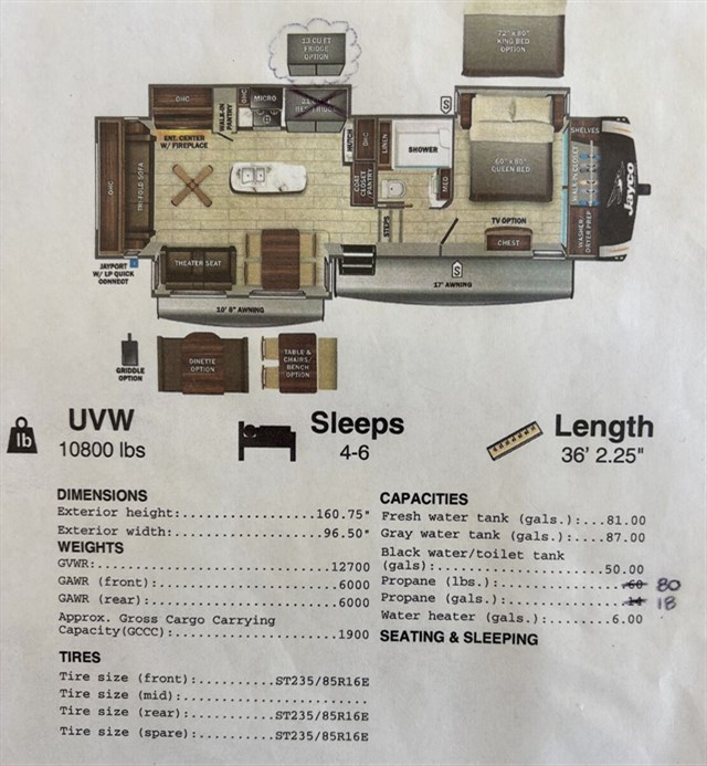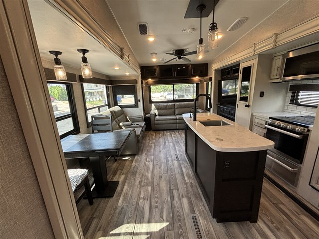 Triple slides for space, plenty of seating spaces, plus a spacious private bedroom make this fifth wheel one you won't want to pass up! You can freshen up each day in the full bath that includes a shower with a seat, a bathroom skylight, plus blue LED nightlights the little ones are sure to love. Once you've cut up some fresh fruit at the kitchen island, whip up some eggs and bacon for breakfast, or just grab the cereal from the walk-in pantry. There is a spacious 21 cu. ft. residential refrigerator, plus a hutch where you can store your own coffee machine. Relax on the tri-fold sofa, theater seat, or free-standing table before heading out for the day. The queen bed slide out in the front private bedroom will be waiting for you when you return,for more space to stretch out!