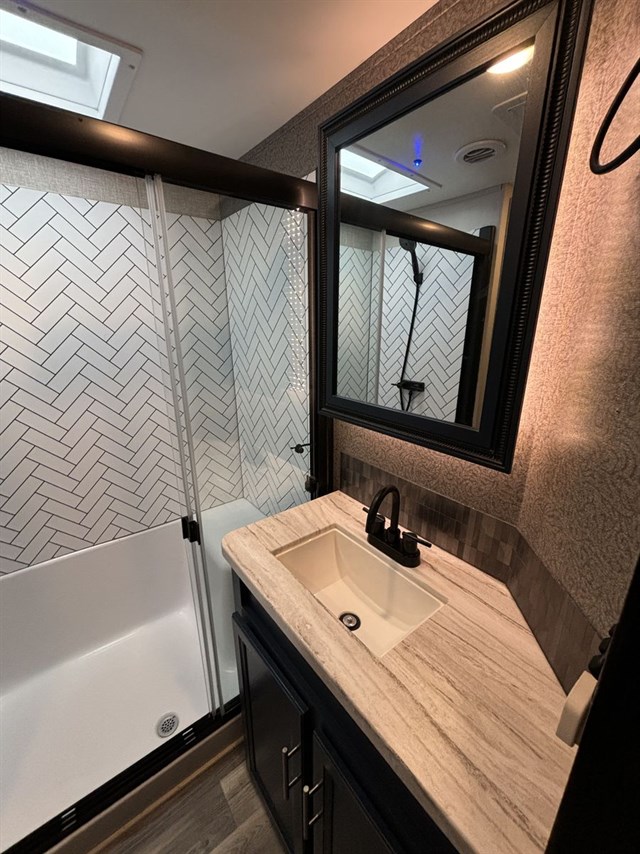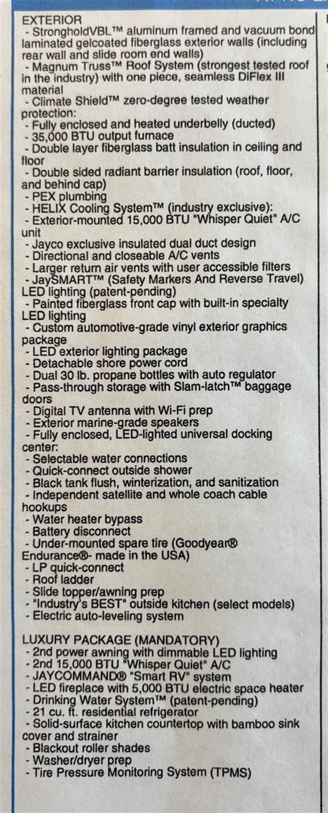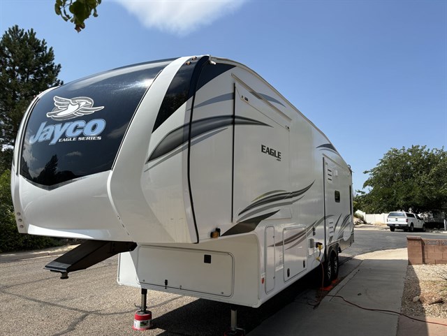 With any Eagle fifth wheel or travel trailer by Jayco you will appreciate durable construction materials, like the Magnum Tuff Roof and the Stonghold VBL laminated walls. The JAYCOMMAND Smart RV system puts you in control of your RV's function, and the 4 Star Handling Package will provide smooth towing from home to camp. Each model features Climate Shield zero-degree tested weather protection and the industry-exclusive HELIX cooling system that features two 15,000 BTU Whisper Quiet A/C's to keep you comfortable year around. Some of the exterior conveniences you are sure to love are the fully enclosed, LED-lit universal docking station, the pass-through storage with Slam-Latch baggage doors, and the painted fiberglass front cap with built-in specialty LED lighting. The Eagle fifth wheels and travel trailers are designed to make you feel at home with solid hardwood slide fascia, residential vinyl flooring, bathroom tile backsplash, and plenty of storage for all your belongings.