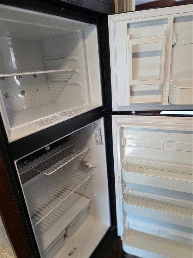 Kitchen: 3-burner range, oven, microwave, and double-door refrigerator.