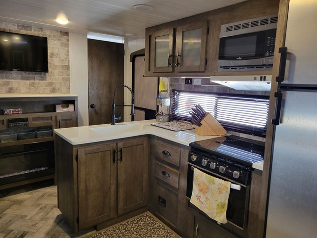 Kitchen: 3-burner range, oven, microwave, mid-size refrigerator
